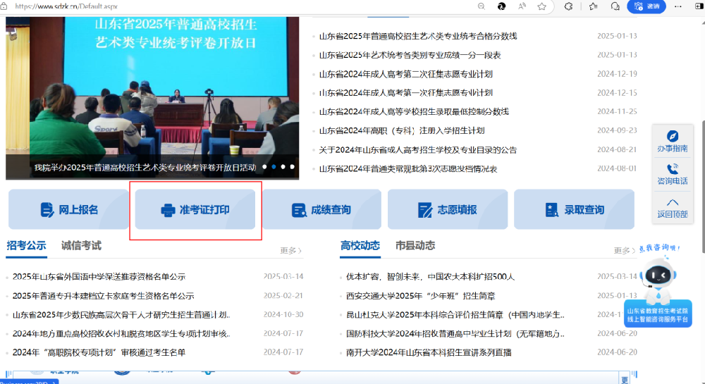 https://zsb.sdzk.cn(点击链接可直接跳转)(打印时间:2025年3月25日至30日每天9:00-17:00.考试当天提前1小时开放准考证打印)