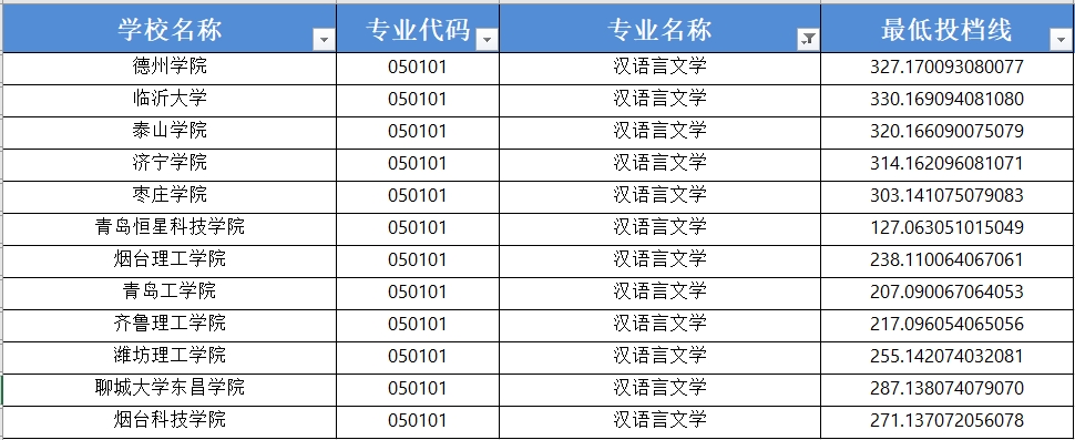 公办院校 :德州学院 327 分,枣庄学院 303 分,泰山学院 320 分,临沂大学 330 分等