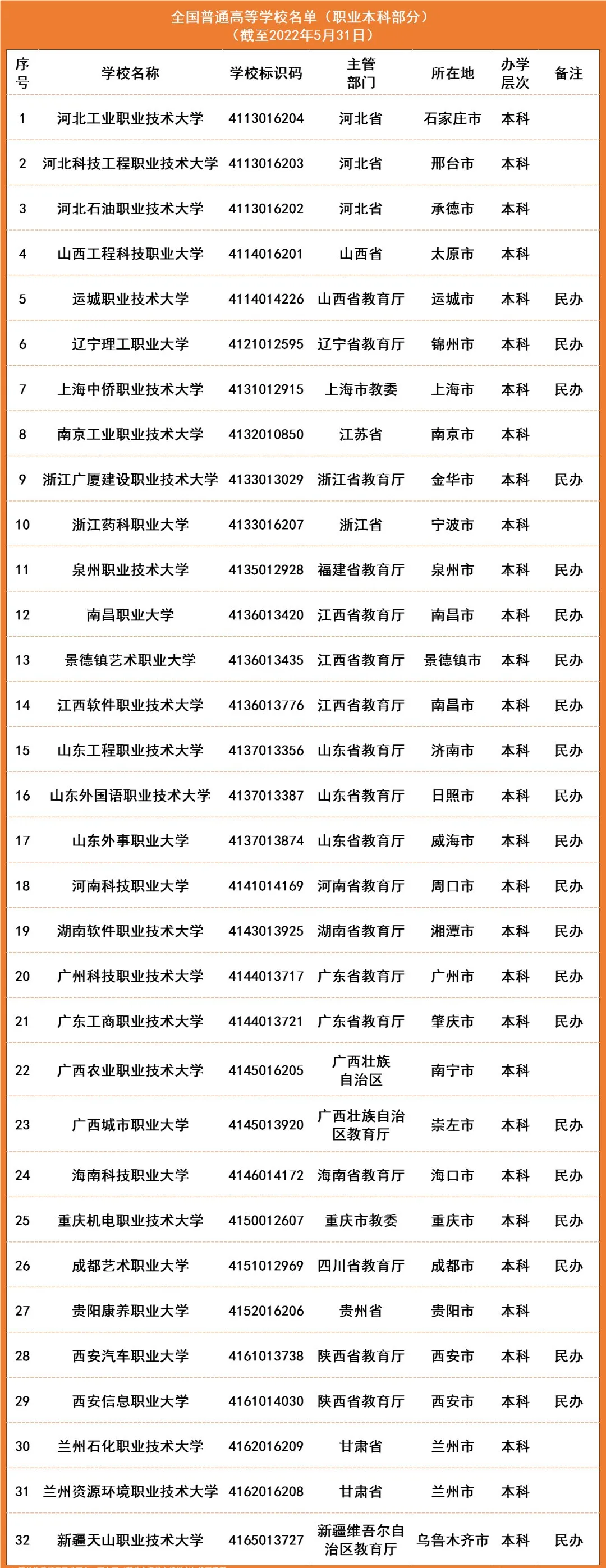 截至2022年1月,我国已新建32所职业本科大学,其中有公办10所,民办22所,这32所职业本科试点学校大多源于两个途径: